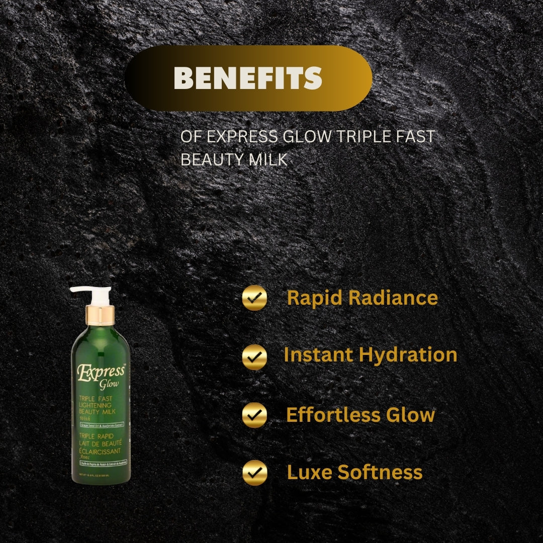Express Glow Triple Fast Beauty Milk 16.8 oz Looking for quick results? Express Glow Triple Fast Beauty Milk is an advanced body lotion that tones and softens the skin while delivering powerful results. If you have resistant skin, this is your solution. Net Weight: 16.8 fl. oz. / 500 ml How to Use: Apply Express Glow Triple Fast beauty Milk evenly onto your body, once or twice a day. For use on the body only!!! Skin Type: Especially formulated for users who need advance with oily and acne prone skin. Can also be used for all skin type. Caution: For external use only. Avoid contact with eyes and lips. If irritation occurs, discontinue use. Do not use on children under 12 years old. Keep in cool and dry place.