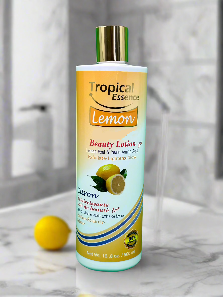Tropical Essence Beauty Lotion With Lemon 500 ml / 16.8 oz Tropical Essence Beauty Lotion with Lemon is a skin lotion that can be used on the body (not intended for the face). Formulated with pure Vitamin-C, this lotion visibly reduces the appearance of dark spots, acne scars, and stretch marks. Lightens Skin Removes Dark Spots Natural Ingredients Fast Acting.