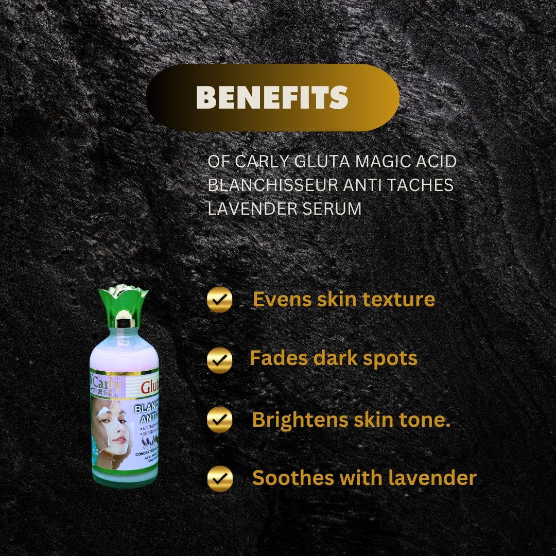 Transform your skin with Carly Gluta Magic Acid Blanchisseur Anti Taches Lavender Serum. This 100ml serum combines the power of glutathione and lavender to brighten and lighten dark spots, leaving you with a radiant and even skin tone. Say goodbye to blemishes and hello to a flawless complexion.