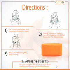 Carotis Exfoliating Soap Cleansing Carrot Soap is a gentle and nourishing cleanser enriched with Vitamin A to soften and smooth the texture of your skin. Our special blend of Coconut Oil, Glycerin, and Apricot Seed Powder deeply cleanses and purifies the skin, leaving it feeling refreshed and clean. Perfect for all skin types, this soap can be used daily to help exfoliate the skin and remove impurities. Follow up with Carotis Moisturizing Cream for more hydrated skin, or Carotis Brightening Gel/Cream/Serum/Body Lotion for lighter and brighter skin. Enjoy smoother and firmer skin with Carotis Exfoliating Soap Cleansing Carrot Soap!