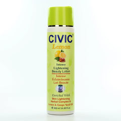 Introducing Civic Lemon Intense Beauty Lotion, a revitalizing lotion made with natural ingredients for a brighter and younger looking complexion. Formulated with lemon peel extract, herbal complex and grape seed oil, this luxurious lotion helps to reduce dark spots, acne, scars, sun blemishes, ageing spots and pregnancy blemishes. With its high concentration of Vitamin C, this lotion can help to gently strip away the top layer of dead skin cells, revealing a smoother and brighter complexion. Achieve your best results when using Civic Lemon Intense Beauty Lotion with Civic Lemon Cream and Civic Lemon Soap.