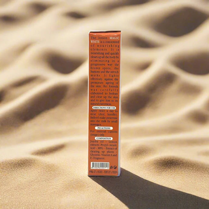 Magic White Lotion of Care is a luxurious and nourishing formula designed to give your skin a natural, healthy glow. Enriched with Argan and Carrot Oils, it helps to reduce the appearance of brown spots, blemishes, and stretch marks, while also fighting premature aging. With its fast-acting properties, it quickly hydrates and clarifies your skin, leaving you with a more youthful and radiant complexion.