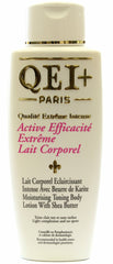 QEI+ Active Efficacite Extreme Lait Corporel Toning Body Lotion 16.8 oz In the range Active Efficacite Extreme, QEI+ has elaborated a moisturizing body milk with Shea Butter, especially developed for black and mixed skins. This new complex based on the best plans active extracts makes it very effective in toning and fading dark spots, for scars, sun blemishes, aging spots, pregnancy blemishes. Result: With continuous use, a lighter even skin, blemish free and protected against imperfections. Lasting and complete action. Directions For Use: Apply QEI+ Active Efficacite lotion once or twice a day on skin previously cleansed with Active Efficacite Exfoliating Soap, insisting on hands, elbows and knees. For an optimal result, we advise to mix lotion with Active Efficacite Serum.