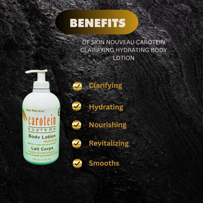 This Skin Nouveau Carotein Lightening Hydrating Body Lotion is expertly formulated to lighten and hydrate skin. With 500ml of product, this lotion effectively nourishes and improves skin tone, leaving you with a glowing, even complexion. Enjoy its benefits as a powerful moisturizer for your entire body.