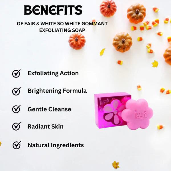 Unlock brighter, smoother skin with Fair & White's Gommant Exfoliating Soap. This 7 oz soap gently removes dead skin cells and impurities for a more radiant complexion. Crafted with natural ingredients, it's suitable for all skin types. Experience the rejuvenating benefits of exfoliation with every use.