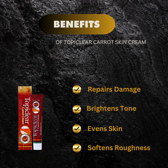 Topiclear Carrot Cream Skin Cream with Sunscreen Agent gradually fades skin discolorations such as age spots, freckles, scars. Directions: Clean your skin with Topiclear Soap. Adult and children over 12 years old apply cream evenly to your skin twice a day or as directed by a doctor. Sun exposure should be limited by using a sunscreen agent, a sun blocking agent or protective clothing to cover skin is completed, to prevent darkening from reoccurring.