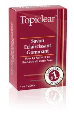 Topiclear Exfoliating Soap To Keep Your Skin Healthy and Fresh This genuine Topiclear soap is formulated to cleanse the skin of impurities, keeping it fresh and moisturized. Topiclear soap protects the skin efficaciously and it elimitates body odors. Helps you fight blackheads, pimples. Use as a toilet soap. INGREDIENTS: Sodium Palmate, Sodium Palm Kernelated, Water (AQUA), Glycerin, Sodium Chloride, algae, Tetrasodium EDTA, BHT, Fragrance (parfum), Parunus Armenaica (Apricot Seed powder) 7oz 200g