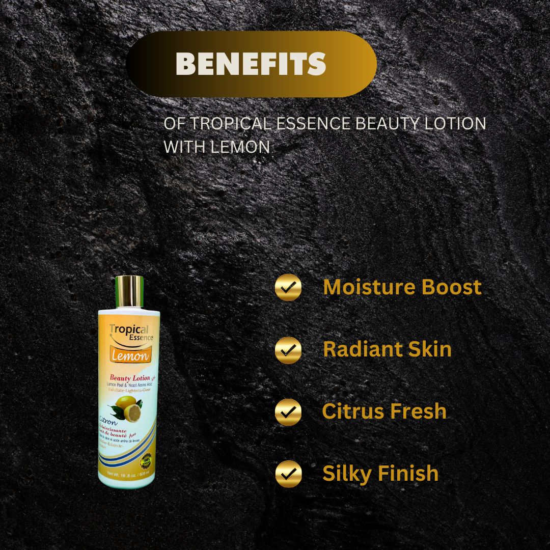 Tropical Essence Beauty Lotion With Lemon 500 ml / 16.8 oz Tropical Essence Beauty Lotion with Lemon is a skin lotion that can be used on the body (not intended for the face). Formulated with pure Vitamin-C, this lotion visibly reduces the appearance of dark spots, acne scars, and stretch marks. Lightens Skin Removes Dark Spots Natural Ingredients Fast Acting.