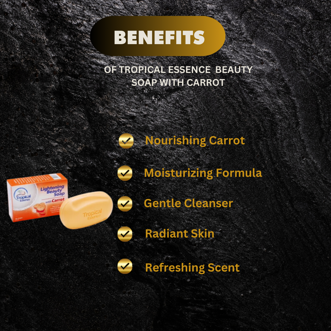 Tropical Essence Beauty Soap With Carrot can be used on the face and body to lighten skin are decrease the appearance of imperfections. Carrot Oil is rich in beta-carotene, vitamins A, B, C, D, E and F. It is a complete tonic for the skin and helps to increase the rate that fresh, bright skin cell appear on the surface, making the skin look younger healthier and more lustrous.