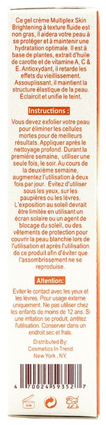 This fluid-textured Multiplex Skin Gel Cream is non-greasy it will help your skin to protect itself and maintain optimal hydration. It is herbal, extract of carrot oil and vitamins A, C & E. Antioxidant, it delays the effects of aging. Softener, it maintains the elastic structure of the skin. It fights against new pigment spots, lightens and unifies the complexion.